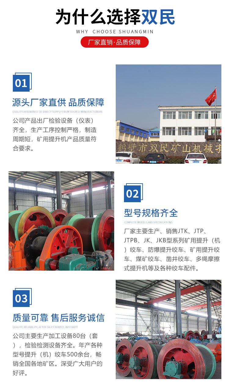鶴壁市雙民礦山機械有限公司是以制造大型礦山提升設(shè)備,電器成套自動化控制系統(tǒng)為主的科研型高科技企業(yè),是國家礦山專用設(shè)備及配件產(chǎn)品定點生產(chǎn)單位。主要生產(chǎn)、銷售JTK、JTP、JTPB、JK、JKB、JKM、JKMD型系列礦用提升絞車、礦井提升機、多繩摩擦式提升機、JZ型
